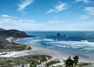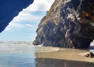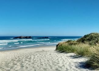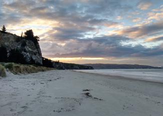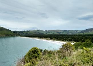 Serene watery area north of Dunedin with large sandy beaches and rock sea caves.